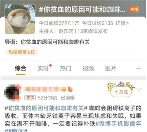 在這些話題下,有很多網友分享自己一次就診的經歷,表示從上班開始自己就經常去喝咖啡,每天會至少喝一杯。但最近感覺到身體很疲憊,僅僅爬4樓就氣喘吁吁,睡覺也睡不夠,在醫院血常規檢測后,診斷自身為貧血,建議補充鐵以及維生素c,強調不要再去喝咖啡和茶,在身體好轉之后,醫生也反復提醒網友,喝咖啡一定要控制好量。