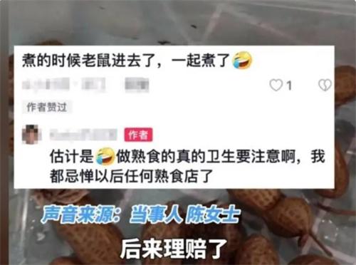 在進行浙江紹興地區一名女子在吃水煮花生的時候吃出老鼠頭的事情,迅速引起了各界人士的關注。該女子回憶表示:“當時她自己一邊刷手機一邊吃花生,最開始以為這些老鼠頭是一些桂皮或者一些調料,然后自己用筷子來回翻動的時候,卻發現了一顆類似牙齒的東西,瞬間自己感到十分惡心,跑到廁所一直嘔吐,應該是老鼠的身體都已經被煮化了,最終店家決定賠償自己800元人民幣。”
