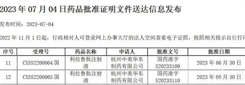 華東醫藥旗下的子公司,杭州中美華東制藥有限公司向相關部門申請的利拉魯肽注射液,肥胖或超重適應癥的上市許可已經獲得了批準。在北京時間2023年的7月5日,華東醫藥公司在股市交易中的股票價格上漲了5%。直到2023年的5月11日,華東醫藥公司的股票價格上漲了3.23%,每股股票的報價為44.8元人民幣,公司的總市值達到了785.8億元人民幣。