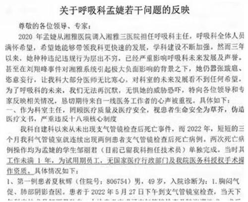 本次被舉報的是湘雅三醫院呼吸與危重癥醫學科主任孟婕,在舉報信當中,稱其放任并沒有手術操作資質的學生鄒某單獨去做支氣管鏡的檢查,使得三個月當中有兩例患者死亡的事件,發生在事發之后,還偽造了醫療文書,讓其他醫生簽字單,擔上這個責任。