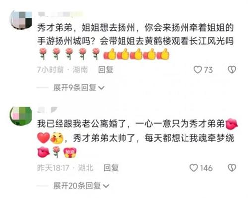 記者看到在“秀才”的賬號視頻下方,隨處能夠看到一些表白,記者點擊多個賬號都能看到賬號都是中老年的女性,多個視頻和“秀才”進行了合拍。甚至有甚者,一天時間當中都會發布多個和“秀才”一起合拍的視頻,同時一笑“傾城”底下也有眾多的稱贊表白,還有男士在評論區作詩,眾多人表示看慣了父母在家里一本正經的說教情況,突然發現父母追星也是十分瘋狂的。