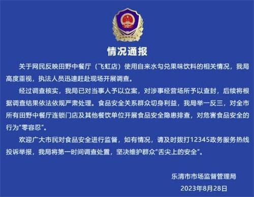 8月26日,有一位顧客前往浙江溫州的田野中餐廳消費(fèi)的時(shí)候發(fā)現(xiàn)店員在洗拖把水槽的地方,用自來(lái)水沖兌橙汁。8月27日了解到設(shè)施的門(mén)店已經(jīng)停業(yè)進(jìn)行整頓,餐廳也發(fā)布了質(zhì)檢的聲明,對(duì)于這一次涉事的員工要嚴(yán)厲的進(jìn)行批評(píng)教育。