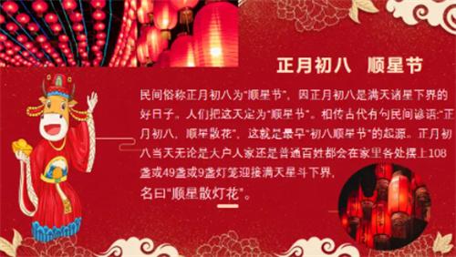 大年初八被稱為順星節,古人流傳稱,每年的大年初八這天晴朗萬分,這也預示著接下來一整年的稻谷豐收,民間以正月初八作為眾星下凡的日子,使用小燈籠點燃來祭祀,稱呼為順星,有的地方也稱之為祭星和接星。