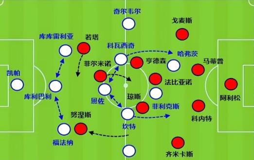 切爾西的三中衛(wèi)體系下,中場(chǎng)不只是三名中前衛(wèi),哈弗茨和菲利克斯也可以是中場(chǎng)。所以他們?cè)诠シ擂D(zhuǎn)換時(shí),既有著極強(qiáng)的中圈對(duì)抗效率,也有著極快的攻防轉(zhuǎn)換速度。切爾西的中場(chǎng)傳球明快精準(zhǔn)和帶球向前快速犀利,相比于利物浦的傳球,更為出色。另外,切爾西三名中衛(wèi)的出球能力也很強(qiáng),使得利物浦的高位壓迫效果不佳,一旦放出空間給對(duì)方傳球,反倒是問(wèn)題很大。