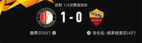 北京時間的4月16日凌晨,歐聯杯1/4決賽的首回合對抗,羅馬客場挑戰費耶諾德0比1輸給對手,上半場比賽迪巴拉因傷退陣,佩萊格里尼罰丟點球,下半場比賽魏費爾順利打進一個世界波,第二回合比賽將會在北京時間的4月21日于羅馬奧林匹克體育場正式開戰。