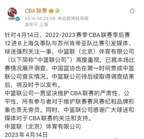 北京時(shí)間4月15日凌晨,中國籃球協(xié)會官方微博發(fā)表了相關(guān)聲明,針對4月14日CBA季后賽12進(jìn)8上海久事隊(duì)VS蘇州肯帝亞隊(duì)比賽,引發(fā)媒體和球迷的強(qiáng)烈不滿一事,中國籃球協(xié)會高度重視,目前已經(jīng)聯(lián)系到了中南聯(lián)體育有限公司,對于本場比賽進(jìn)行著重調(diào)查,并且要求兩家俱樂部以書面形式對本場比賽進(jìn)行報(bào)告,后續(xù)的所有處理結(jié)果全部都會公布在相關(guān)的社交媒體,如果確實(shí)存在著一些違規(guī)的情況,將會根據(jù)聯(lián)盟的相關(guān)規(guī)定絕不姑息,堅(jiān)決捍衛(wèi)聯(lián)賽的公平公正。