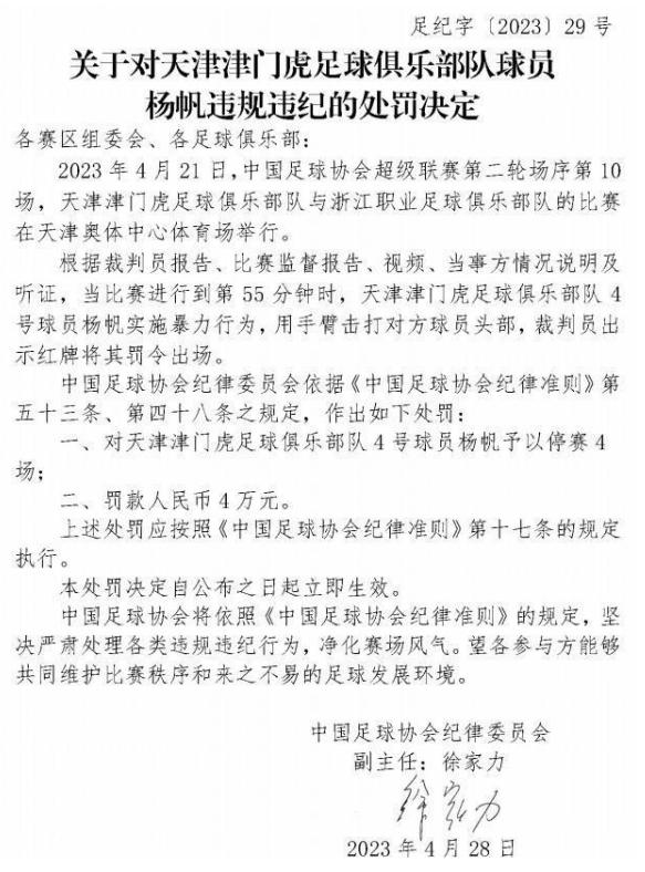 4月28日晚,中國足協接連開出兩張罰單,第一張罰單是成都蓉城主場被警告,第二張罰單是對津門虎球員楊帆追加禁賽四場和罰款四萬的罰單,中國足球協會紀律委員會在通告中稱,足協將會按照相關規定,堅決對賽場上的各種違紀違規行為進行處理,要堅決凈化賽場風氣,維護足壇來之不易的發展環境。