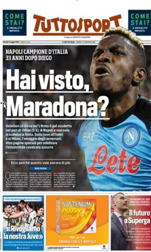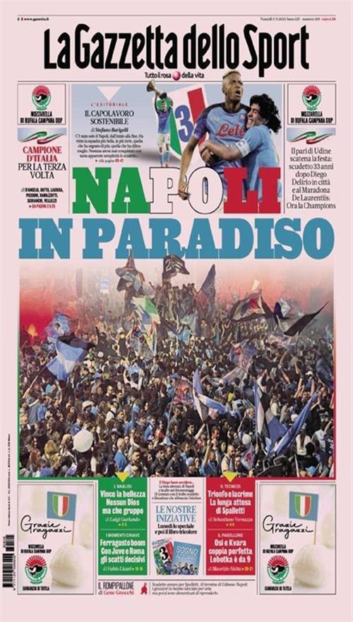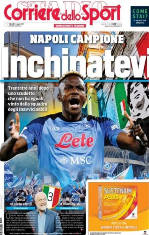 5月5日,意大利的三大體育報《羅馬體育報》《米蘭體育報》和《都靈體育報》的頭版頭條全都給了那不勒斯,時隔33年那不勒斯再次奪得意甲冠軍,三大體育報紛紛發文祝賀。2022-23賽季意甲聯賽第33輪,那不勒斯客場1-1戰平烏迪內斯,33場比賽一共獲得了80分,穩居積分榜第一名,領先第二名拉齊奧16分,即便后面5場比賽全輸也已經鎖定了聯賽冠軍。