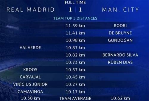在整個球隊平均跑動距離方面,曼城客場作戰的平均跑動距離為10.62公里,領先于皇家馬德里的10.30公里。