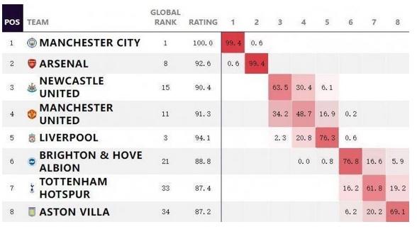 數(shù)據(jù)機(jī)構(gòu)OPTA預(yù)測(cè)的英超最終排名如下: