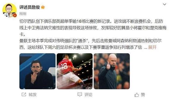 在最新的英超比賽中,曼聯以4-1的比分擊敗了切爾西,賽后,評述員詹俊發表了自己的觀點。
