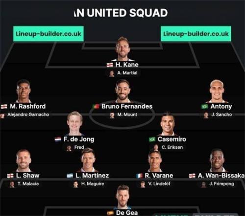 前鋒:拉什福德(替補:加納喬)、哈里-凱恩(替補:馬夏爾)、安東尼(替補:桑喬)