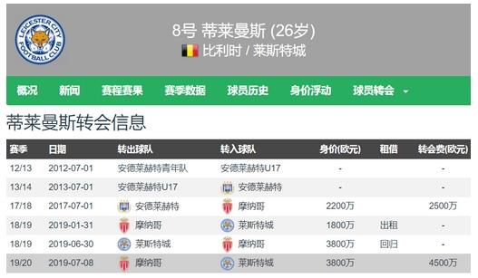 蒂萊曼斯是比利時(shí)豪門安德萊赫特青訓(xùn)的產(chǎn)品,他在2017年以2500萬歐元的轉(zhuǎn)會(huì)費(fèi)首次登陸五大聯(lián)賽,加盟法甲摩納哥。之后,在2019年夏季轉(zhuǎn)會(huì)窗口,他以4500萬歐元的轉(zhuǎn)會(huì)費(fèi)從摩納哥加盟英超的萊斯特城。