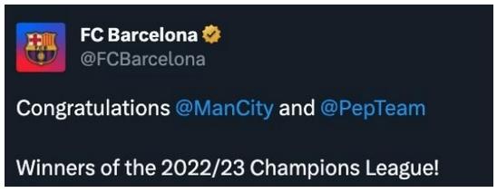 賽后,巴塞羅那俱樂部官方立即向曼城和瓜迪奧拉表示祝賀,拜仁慕尼黑也不甘示弱,向瓜迪奧拉和曼城表達了真摯的祝賀之意。