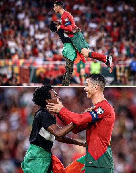 然而,這場比賽中發(fā)生了一個小插曲。一名球迷沖進(jìn)球場,興高采烈地抱住C羅,跪地親吻了他的腳,并舉起他高高,模仿了C羅的經(jīng)典慶祝動作。當(dāng)安保人員上場試圖將他帶離時,他舉著葡萄牙國旗在球場上高興地奔跑。