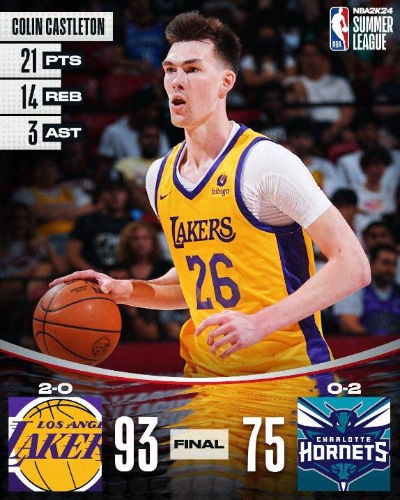 湖人隊以93-75擊敗黃蜂隊。湖人隊的核心球員馬克思-克里斯蒂雖然在得分方面表現一般,只得到11分,但他在其他方面的貢獻也不容忽視,包括6次助攻、4個籃板和4次封蓋。而湖人隊的雙向合同中鋒科林-卡斯爾頓則砍下了21分14籃板的大號兩雙。盡管黃蜂隊的榜眼秀布蘭登-米勒的表現仍然不佳,但他們最終以較大的優勢戰勝了對手。