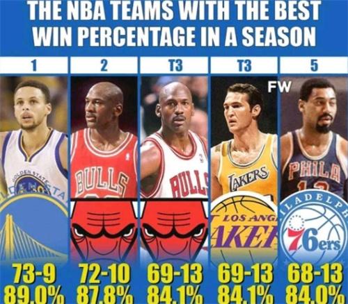 1.勇士隊(2015-2016賽季):73勝9負,勝率89%;