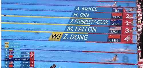 這場比賽覃海洋的狀態可以十分的不錯,在預選賽的成績里面,它是以2分09秒86進入的半決賽。在半決賽當中,他整整提升了兩秒的時間,成功進入到總決賽,在前50m的競技過程當中,覃海洋只是用了28秒70就成功的游玩一圈,并且排在了第一名,而日本選手緊隨其后,排在了第二名,在150m的過程當中,太陽排在了第二名,排在第一的是澳大利亞的選手。在最后快要到達終點的時候,覃海洋拼命的沖刺最還是沒有能夠超過澳大利亞選手,獲得了半決賽的第二名,總成績排在了第三名,成功進入決賽。