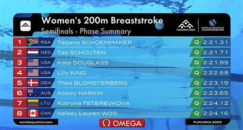 北京時間7月27日,在日本福岡世錦賽當中,女子200m蛙泳進行半決賽,中國選手葉詩文在這場比賽當中沒有能夠成功的進入到決賽最后僅僅只差0.6秒,當葉詩文到達終點以后。他的成績定格在2分24秒76,排在了所在小組的第五名,而總成績卻是排在了第十名,真的只差最后0.6秒他就能夠進入到決賽,這對于他來說非常的遺憾,盡管努力了這么久,但還是沒有能夠成功。葉詩文在這一次的福岡世錦賽當中的預選成績是2分25秒93,是以小組第三名的好成績進入到了半決賽。