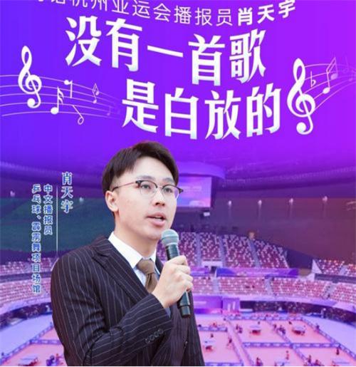2023年10月9日,杭州第19屆亞運會播報員肖天宇在面對采訪時表示,沒有一首歌是白放的,本屆亞運會的氣氛組非播音人員莫屬。