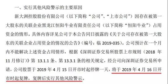 昨晚新大洲A公告,因存在被第一大股東尚衡冠通的關聯企業恒陽牛業占用資金的情形,占用資金達4.77億元。公司股票15日停牌一天,16日復牌后實行其他風險警示,股票簡稱由“新大洲A”變為“ST大洲”。