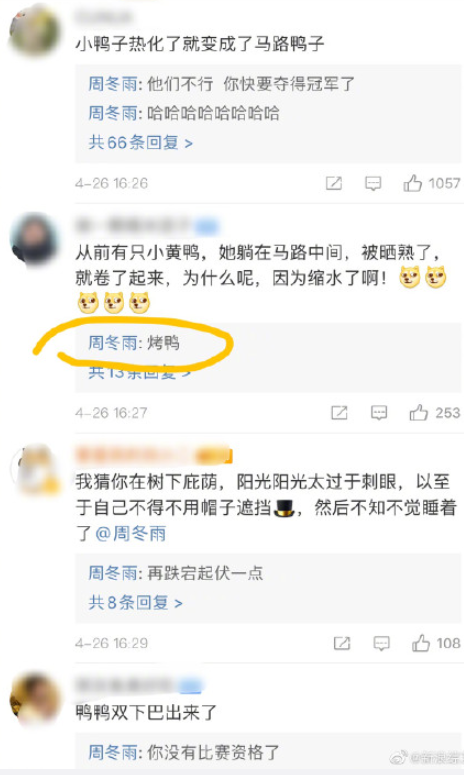 網(wǎng)友紛紛評論道:“小鴨子熱化了就變成了馬路鴨子”“鴨鴨雙下巴出來了”“哪里跌倒就在哪里躺下”“小黃鴨的碰瓷?” 隨后周冬雨回復(fù)了某網(wǎng)友的評論,公布了答案:“烤鴨”,幽默十足。