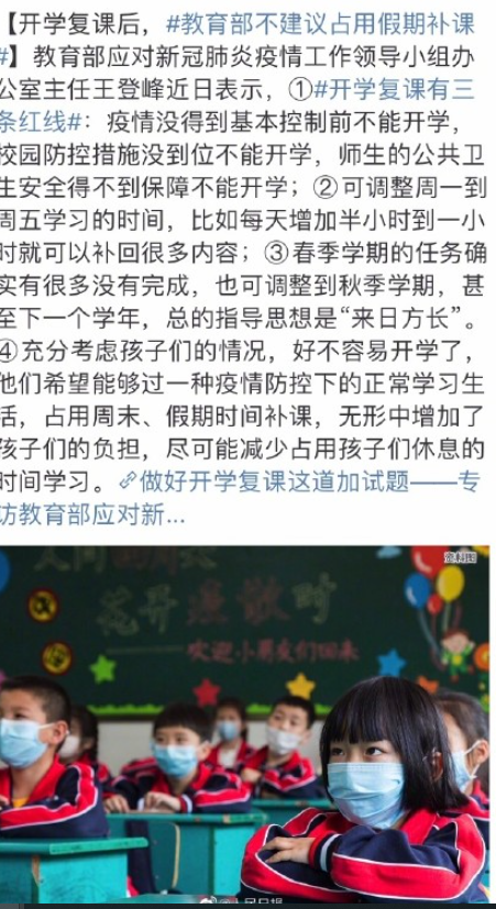 教育部應對新冠肺炎疫情工作領導小組辦公室主任王登峰近日表示,①#開學復課有三條紅線#:疫情沒得到基本控制前不能開學,校園防控措施沒到位不能開學,師生的公共衛生安全得不到保障不能開學;②可調整周一到周五學習的時間,比如每天增加半小時到一小時就可以補回很多內容;③春季學期的任務確實有很多沒有完成,也可調整到秋季學期,甚至下一個學年,總的指導思想是“來日方長”。④充分考慮孩子們的情況,好不容易開學了,他們希望能夠過一種疫情防控下的正常學習生活,占用周末、假期時間補課,無形中增加了孩子們的負擔,盡可能減少占用孩子們休息的時間學習。