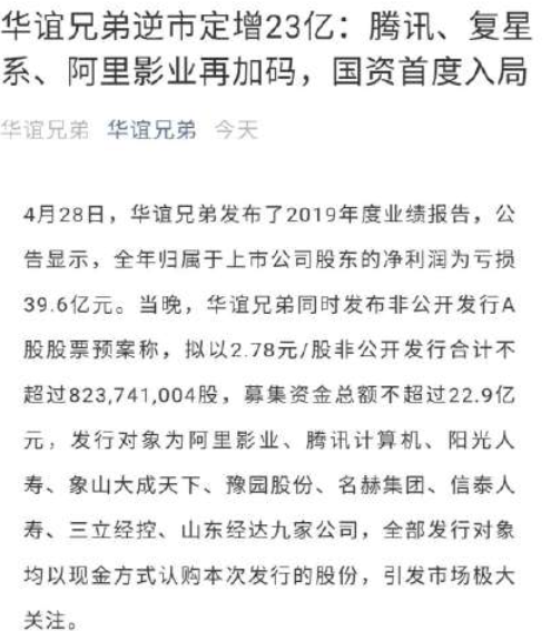 4月28日,華誼兄弟發布了2019年度業績報告,公告顯示,全年歸屬于上市公司股東的凈利潤為虧損39.6億元。當晚,華誼兄弟同時發布非公開發行A股股票預案稱,擬以2.78元/股非公開發行合計不超過823,741,004股,募集資金總額不超過22.9億元,發行對象為阿里影業、騰訊計算機、陽光人壽、象山大成天下、豫園股份、名赫集團、信泰人壽、三立經控、山東經達九家公司,全部發行對象均以現金方式認購本次發行的股份,引發市場極大關注。