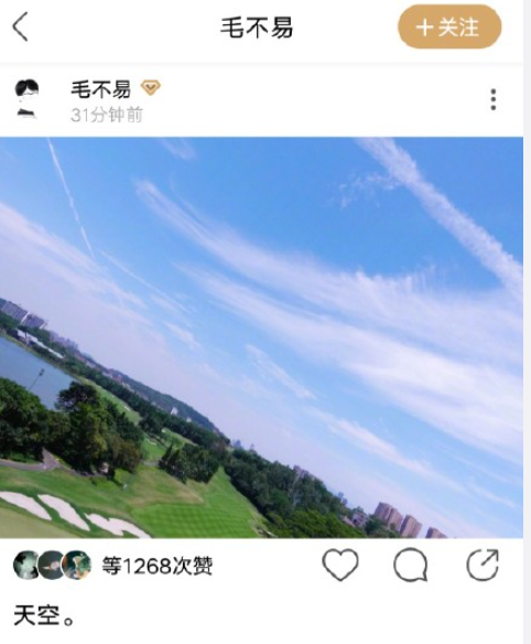 4月30日,毛不易[微博]正式入駐綠洲更新動態,他曬出一張天空照,照片中毛不易以傾斜的視角捕捉了湛藍的天空與綠地,盡顯浪漫巧思。