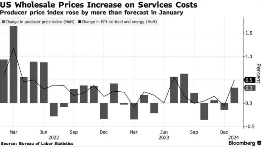 5月14日消息,四月份美國ppi指數環比上漲約0.5%左右,同比數據上漲了約2.2%左右,各項數據均高于市場普遍預期,四月份ppi相較去年已經達到一年以來的最高漲幅,其中服務價格的上漲幅度來到0.6%,是推動當月ppi上漲的主要因素。