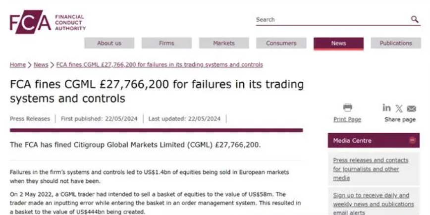 2.此次花旗集團的系統違規行為是導致受到制裁的主要原因之一,在此前的一項違規事件中,花旗集團曾導致歐洲的股市突然出現了持續幾分鐘的大幅度下跌情況,后續FCA指出,花旗集團的系統設計存在缺陷,導致實施監管機制無效。