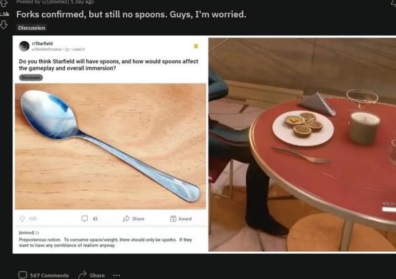 玩家發布文案的時候還上傳了一張截圖,發帖人表示:“你們認為《星空》終會有勺子嗎?勺子會如何影響游戲玩法和整體沉浸感?”最終的結果證明這位玩家擔心是正確的。從圖片中可以看到角色,圍坐在桌子旁邊在準備吃東西,但是桌子上只有叉子,并沒有勺子,這也讓很多玩家認為游戲的體驗感會大大降低。游戲中雖然沒有勺子,但是還有很多不需要勺子就可以吃到的食物。游戲愛好者將自己喜歡的三明治加入到作品中,就不需要借助勺子。