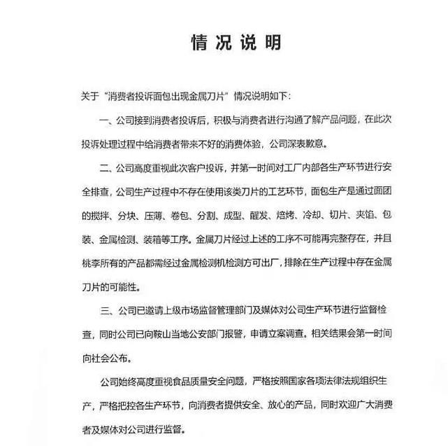 2月10日逃離面包,因?yàn)橄M(fèi)者在使用過程中在面包中發(fā)現(xiàn)了帶修刀片的新聞,立即引起了廣大網(wǎng)友的關(guān)注,該事件發(fā)生之后,桃李面包第一時(shí)間就對于此事作出了回應(yīng),根據(jù)桃李面包所發(fā)布的公告顯示對于此次消費(fèi)者的投訴,公司已經(jīng)高度重視,目前已經(jīng)開展了對生產(chǎn)工廠內(nèi)的生產(chǎn)安全排查,桃李面包公司還表示在此類面包的生產(chǎn)過程中,并不存在使用改刀片的任何環(huán)節(jié),金屬刀片在面包的生產(chǎn)過程中是沒有用到的,目前所有的產(chǎn)品都是經(jīng)過嚴(yán)格的檢測之后才可以出廠銷售,對于目前消費(fèi)者吃出金屬刀片的事情在生產(chǎn)過程中是不可能出現(xiàn)的,目前公司已經(jīng)向鞍山當(dāng)?shù)氐墓膊块T報(bào)警。