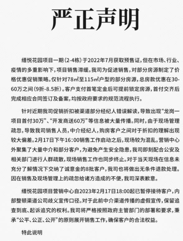 目前該樓盤已經發布了聲明稱目前該公司的項目促銷主要是對部分的房源制定的價格進行優惠促銷政策,此次的促銷范圍只針對七十五八平方到115平方戶型的,部分房源并且總房款的優惠幅度就達到了30萬元到60萬元,客戶在支付了首筆定金之后,就可以提前鎖定房源,等到首付交完之后,才會進行相應的合同簽訂以及備案,完全按照政府的相關流程進行銷售。
