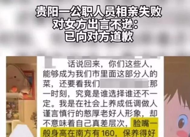 目前眾多的年輕人結(jié)婚都是依靠朋友介紹和親戚介紹進(jìn)行的相親,對(duì)于一些年輕的男女,在相親過(guò)程中,如果和對(duì)方?jīng)]有好感那么一般都不會(huì)有太多的交集,只是簡(jiǎn)單的吃個(gè)飯見(jiàn)個(gè)面就不會(huì)再有深入的接觸,但是最近貴州貴陽(yáng)市的一名公職人員在去相親后因?yàn)榕讲辉敢夂推浣煌蛯?duì)女方出言不遜此時(shí)已經(jīng)引起了網(wǎng)友的熱議,從雙方的聊天記錄可以看出這名公職人員對(duì)女方說(shuō)的話,非常讓人感到不舒服。