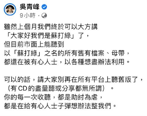 吳青峰發文中還表示目前上線數位平臺的蘇打綠歌曲,正在全力的對蘇打綠的剩余價值進行發掘,雖然說目前的音樂平臺上所聽到的蘇打綠的歌,所有的收益和吳青峰以及音樂團的團員都沒有任何的收益,這些收入全部都進入到了前經紀人的賬戶,吳青峰也呼吁所有歌迷堅決抵制盜版母帶。