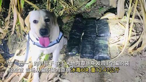 在當晚的18點左右,支隊工信邊境派出所的管理警察與警犬“云一”一起在云南邊境進行巡邏檢查,在巡查的過程中途經(jīng)一片玉米地,警犬“云一”突然表現(xiàn)得十分興奮,不斷“汪汪”大叫給警察示警。警察在“云一”的帶領下在玉米地的一處草叢下面發(fā)現(xiàn)了一個不明編織袋,經(jīng)過檢查之后,從編織袋內(nèi)查獲冰毒6塊,重達12.47公斤,“云一”立下大功。
