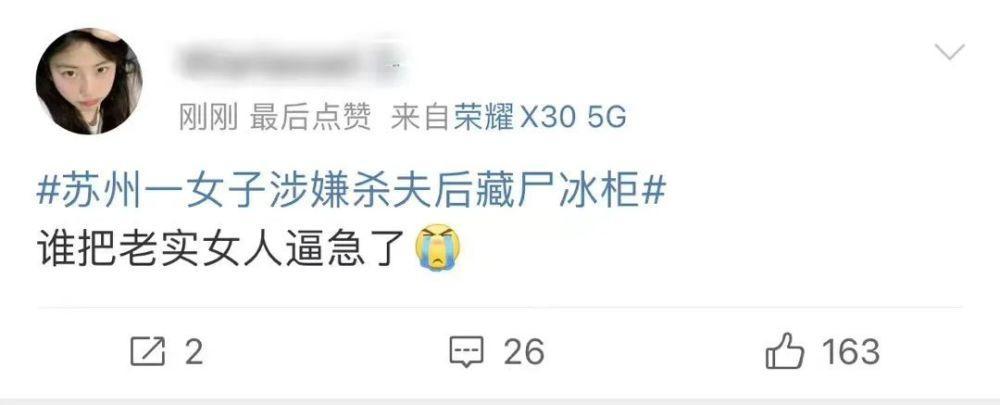 蘇州一女子將其丈夫殺害之后,藏尸在冰柜里,并且多次利用丈夫的手機向公婆騙取錢財。這名女子的家人發(fā)現(xiàn)之后,勸其投案自首并且報警。去年中秋,受害人的父母還曾經(jīng)陪該名女子過中秋。據(jù)稱是這一名女子的母親發(fā)現(xiàn)了冰箱里的情況,并且勸其而自首。