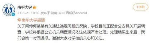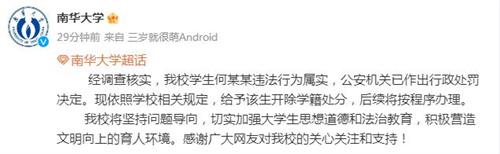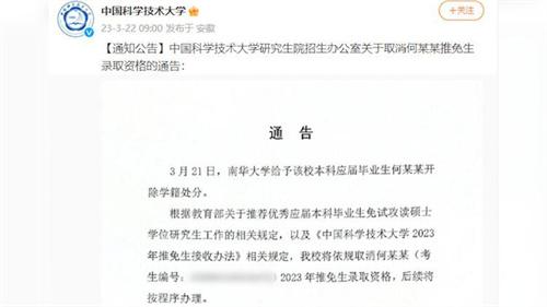 3月21日,中國科學技術大學研究生招生辦公室發布一則通告,關于取消造黃謠男生的錄取資格。公告聲稱,已經收到了南華大學對何某開除學籍的處分,根據教育部推薦優秀應屆本科生免試讀碩士學位的相關規定和中國科學技術大學2023年推薦生接收辦法規定,取消合同的錄取資格。
