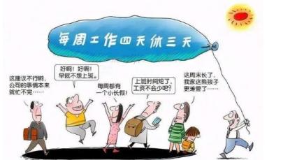 針對于做四休三的工作方式網友對此的看法也是兩句話,有些網友認為做四修山可以讓人們工作中的壓力得到很大的緩解,同時也并沒有降低工作效率是一種可行的方式。另外一種看法就是網友認為周一周二上班周三休息,很有可能會打斷這一周二工作的連續(xù)性,我們在工作中提倡的是雙休制,但是因為工作的加班原因很難正兒八經的得到雙休,什么時候能夠每個周末都能擁有雙休的時候,做四休三才離我們不遠,現在連雙休都很難普及做四休三更是遙不可及。