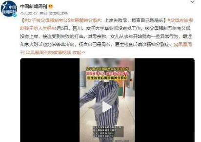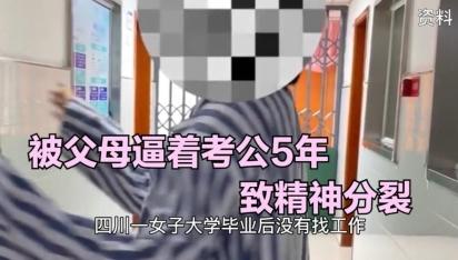 四川一名女子在大學畢業之后,由于一直沒找到工作,被父母強迫考公務員,由于連續5年沒能考中受到打擊而精神分裂。據這名女子的母親表示,從去年開始女兒就有了一些不正常的行為,和家人進行對話時,也經常出現答非所問的情況,并且還揚言自己是某某局長,在醫生進行檢查之后,判定該名女子患上了精神分裂。
