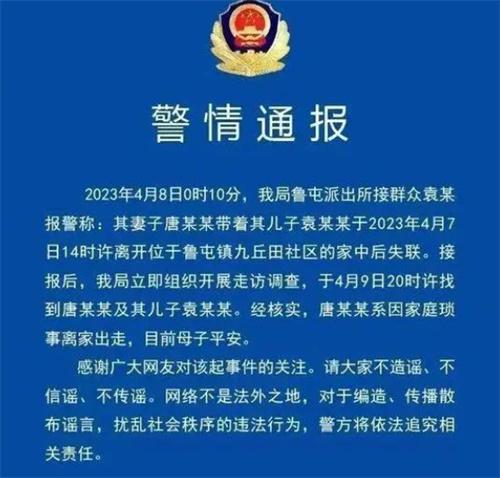 此事經(jīng)過(guò)網(wǎng)友的傳播,在網(wǎng)絡(luò)上引起一些有關(guān)母子失蹤的謠傳,對(duì)于廣大網(wǎng)友對(duì)此事間的關(guān)注要表示感謝,但同時(shí),網(wǎng)絡(luò)上并不是一個(gè)法外之地,網(wǎng)友在網(wǎng)上沖浪要做到不信謠,不傳謠,不造謠,對(duì)于一些額外編造謠言,散布謠言的群體要堅(jiān)決杜絕,不要感覺(jué)自己身在網(wǎng)絡(luò)上就可以擾亂社會(huì)秩序,做出各種違法的行為,警方也會(huì)堅(jiān)決打擊這樣的違法事件。
