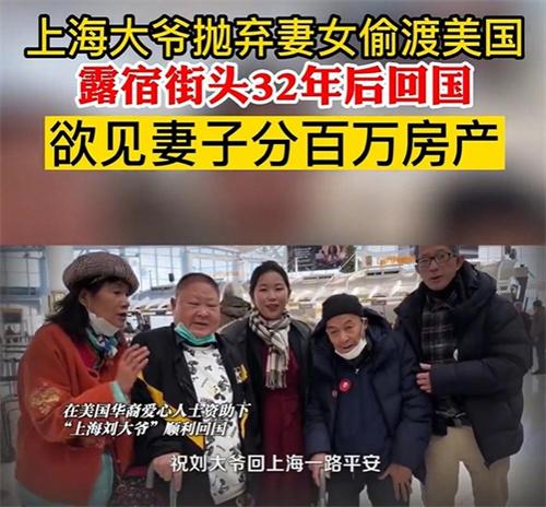 上海的劉大爺在32年前拋妻棄子跟著哥哥遠(yuǎn)赴美國謀生,而且還將家中的所有積蓄全部帶走。但是由于二人是偷渡的身份,沒能夠在美國有很好的出路,一直以來在美國流浪。直到上海同鄉(xiāng)會的人在美國發(fā)現(xiàn)了劉大爺,大發(fā)善心給予救助。幫助他補辦了護照,而且還籌集了1.5萬美金為他購買機票幫助他回國。但是劉大爺?shù)钠夼趧⒋鬆敾貒髤s拒絕與其相認(rèn)。劉大爺在回國之后也謊話連篇,生成自己,為了回國與家人團聚,拒絕了美國救助站分配的房子,想在回國之后好好的照顧自己的妻子。實際上這些都是他的謊言,回國之后的劉大爺不僅沒有對30多年來沒有給家庭做出任何的貢獻(xiàn)而愧疚,反而想要瓜分妻子和女兒的房產(chǎn)。對此,網(wǎng)絡(luò)上對劉大爺表示了指責(zé)。