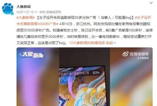 這名網友表示自己沒有開通優酷會員,在觀看電視的時候每一集大概都是有100多秒的廣告,在連續觀看5集之后播到第6集電視頁面上突然出現了3000多秒的字樣,瞬間就被震驚了沒想到觀看廣告的時長,比一集電視劇播放的時長還要久,隨即這名網友就返回到首頁,再重新打開就變回了正常的100多秒,該網友表示應該是優酷視頻出現了bug。