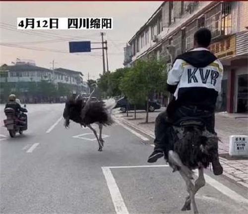 四川綿陽一名男子于4月12日騎著鴕鳥在機動車道上前行,周圍有很多車輛不斷的經過。還拍攝了視頻發布到網絡上進行炫耀,聲稱你們有奔馳寶馬,我有24小時360度全天窗恒溫環保的新能源座駕。