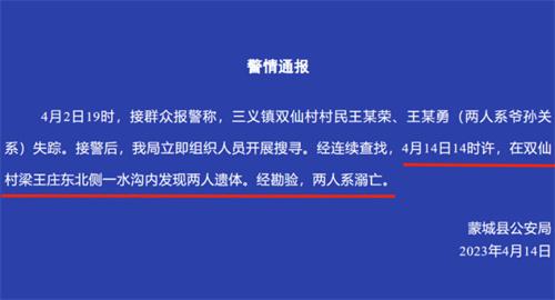 據媒體報道,安徽亳州蒙城縣雙仙村村民王朝榮和他的孫子王志勇遺體在4月14日14時左右成功找到,據王朝榮家屬告訴媒體,爺孫倆的遺體在農田附近的河道淤泥中被發現,據警方調查所述,兩人的死亡應該是溺亡,媒體在4月2日16時曾經報道,爺孫兩人在農田中拔草,后來到農田北頭的池塘邊燒垃圾,從此之后便與家中失聯,當地警方派出救援隊伍搜尋了十幾天都沒有找到。