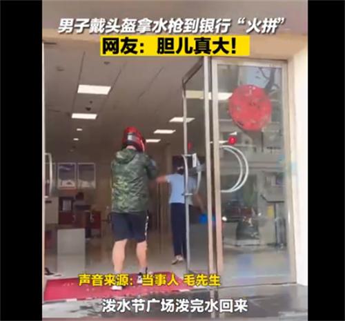 4月14日消息,在云南德宏潑水節(jié)當(dāng)日,某銀行工作人員向路過的小伙潑水,這位小伙竟然頭戴頭盔,手持水槍沖進(jìn)銀行和銀行的工作人員火拼,這段視頻在網(wǎng)上曝光之后,讓很多網(wǎng)友大呼羨慕,聲稱潑水節(jié)真是獨(dú)屬于云南人民的快樂節(jié)日,還有網(wǎng)友宣稱,全國各地都可以借鑒潑水節(jié),讓大家一同來度過這個(gè)歡樂節(jié)日。