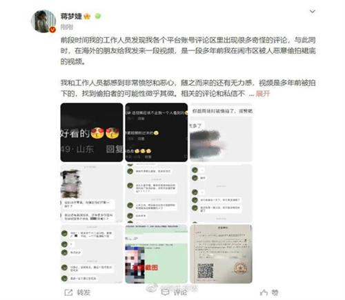 根據(jù)蔣夢(mèng)婕所描述的信息來(lái)看,蔣夢(mèng)婕團(tuán)隊(duì)的工作人員發(fā)現(xiàn)她的社交平臺(tái)賬號(hào)評(píng)論區(qū)出現(xiàn)了很多奇怪的評(píng)論,與此同時(shí),蔣夢(mèng)婕在海外的朋友給她發(fā)來(lái)的一條多年以前曾經(jīng)在鬧市區(qū)被人惡意偷拍裙底的視頻,對(duì)于這起事件,蔣夢(mèng)婕團(tuán)隊(duì)和她本人都感覺(jué)到十分憤怒,不過(guò)由于該視頻是多年以前拍下來(lái)的,想要找到視頻偷拍者非常困難,不久之后她卻收到了一條私信,聲稱會(huì)將該視頻發(fā)給各大影視公司和品牌,并勒索蔣夢(mèng)婕。