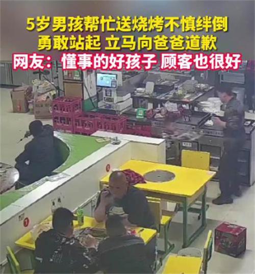 近日一名河南周口的5歲男孩放學之后由于家里面是開飯店的,生意比較忙這名5歲的孩子就下學之后幫助家里在飯店幫忙,在給一桌客人端烤魚時,不小心被地上的一箱啤酒絆倒,男孩急忙起身,先給爸爸道歉,而客人也急忙將孩子火了起來,稱烤魚還可以吃,不需要更換,該視頻也引起了網友的廣泛關注,紛紛稱贊這5歲的男孩懂事兒,根據男孩父親尚先生的介紹,自己的孩子當時在店里幫忙,不小心摔倒之后當時也沒有哭,而是先向自己道歉,稱不小心將烤魚摔在了地上,當時尚先生看到孩子的懂事,非常的感動。