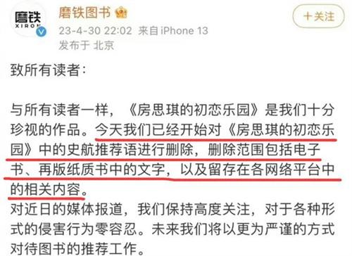 此前這一指控發出了之后,事件態勢再進一步遭到升級,眾多的受害者紛紛站出來為此發聲,表示史航對自身有過性騷擾的行為,目前發出聲明的受害者已經至少有12名,同時公眾也和上有一些合作的機構發出了一些呼吁,希望這些機構能夠正式的做出表態。磨鐵圖書在微博上于4月30日晚上發布的聲明表示,其中《房思琪初戀樂園》這一書當中,史航對書籍的推薦語作出了刪除處理,再版的紙質圖書,電子書和網絡平臺相關內容都會作出刪除。